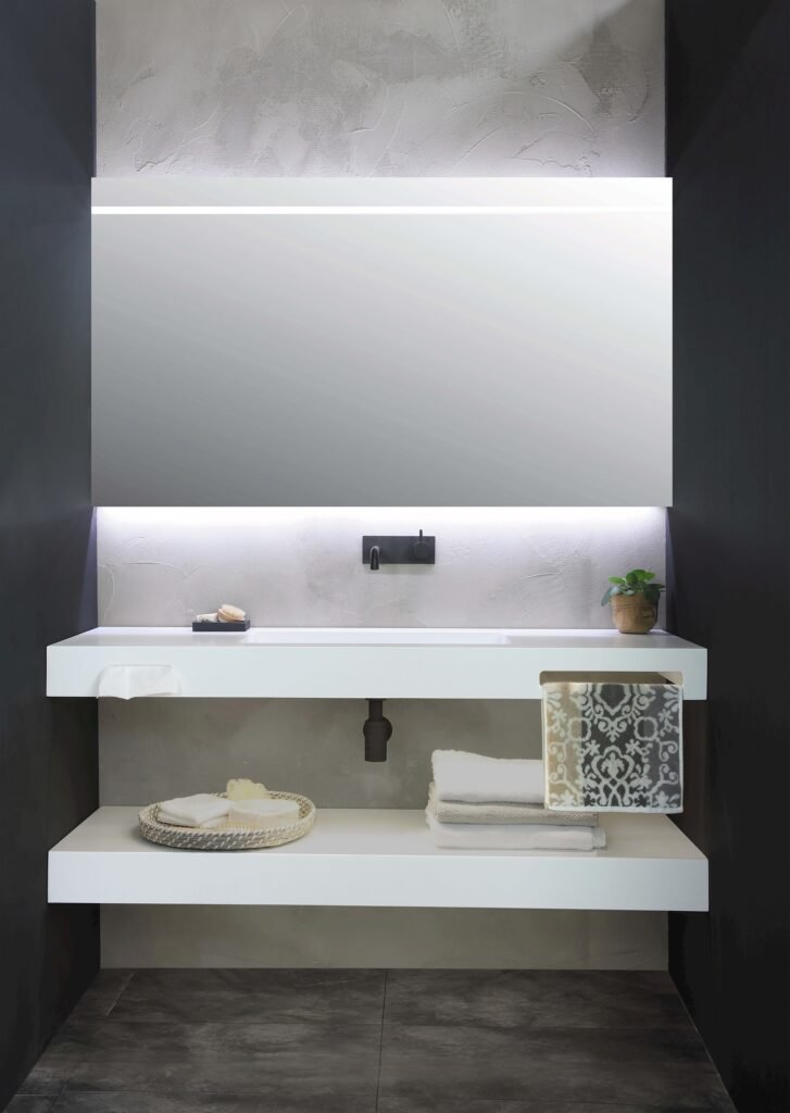 Stylish bathroom vanities with innovative storage to reduce clutter.